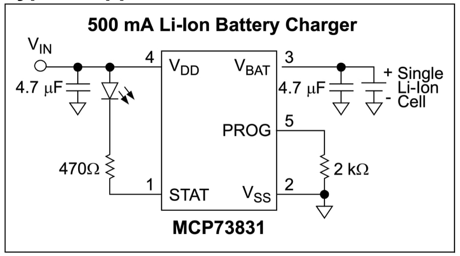 These hooks allow for maximizing the battery life balanced with how much power is available on a fully charged battery. The device features thermal and ESD protection for safety. While the MCP73831/2 series is for coin cell batteries, larger battery charging circuits run on the same principles.