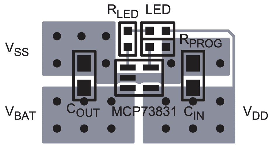 Figure 3. The battery charger’s recommended PCB layout provides what I see as one counterintuitive data point. That would be the thin VDD line that drives the LED. Note that they also have a bottom side view where the VSS (ground) is a rectangle above two others for Vbat and Vdd. Image Credit: Microchip