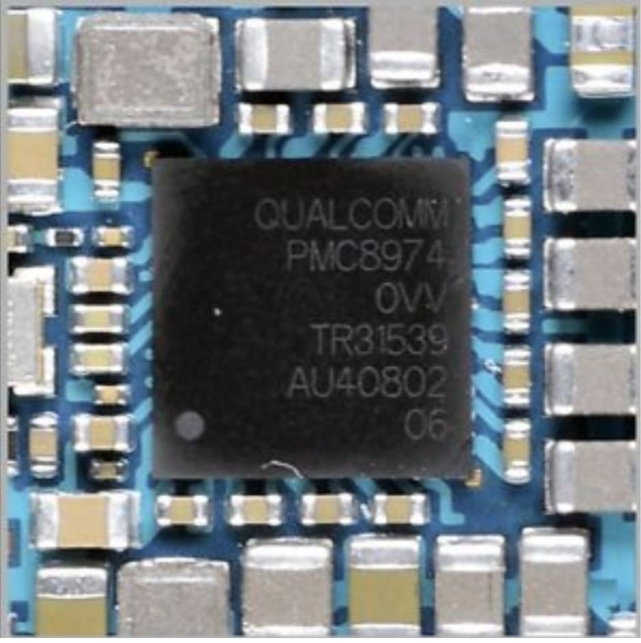 Figure 4. This PMC8974 device from Qualcomm is surrounded by filter circuits for power domains ranging between 2.5V and 5.25V. Newer devices may output a range of half of those voltage values. Features include voltage regulation, DC-DC conversion, and battery management. Image Credit: eBay