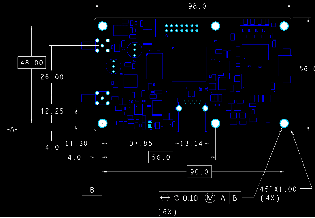 Figure 3. The feature control box at the bottom of this view can have a number of different figures besides the cross-hair symbol for positional tolerance. Other geometric tolerances that are common on PCBs include flatness, runout, parallelism, and profile. Each one creates a zone of acceptable outcomes. Image Credit: Author.