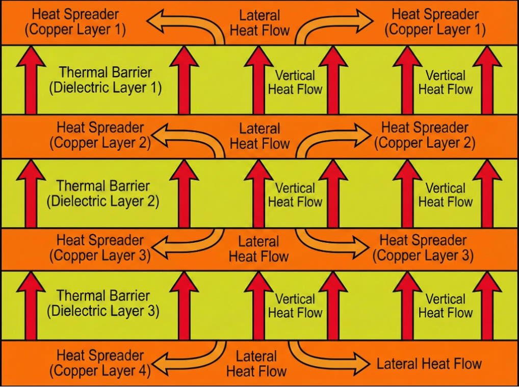 Dielectric layers act as thermal barriers that heat must traverse vertically to reach the next copper spreading plane. Thinner dielectrics reduce this barrier, improving vertical heat transfer, but at the cost of concentrated heat intensity at each copper layer.