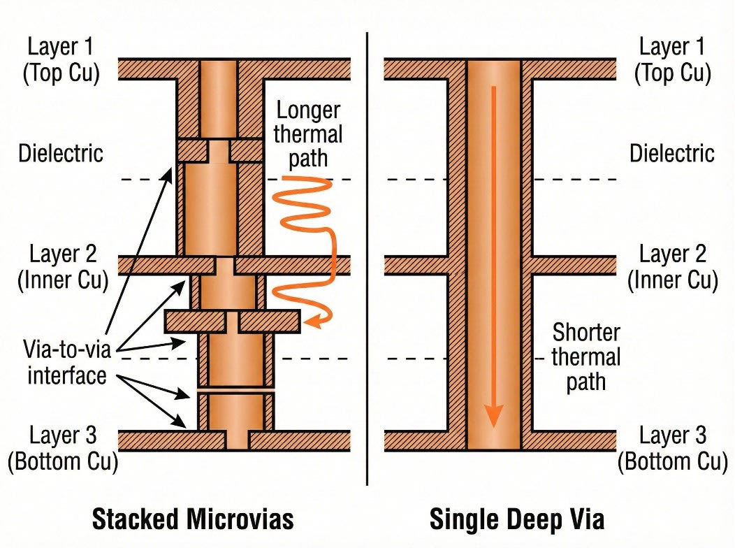 Figure 3: Stacked microvias vs. a single deep via, with labels highlighting the via-to-via interfaces and the longer thermal path in the stacked configuration.