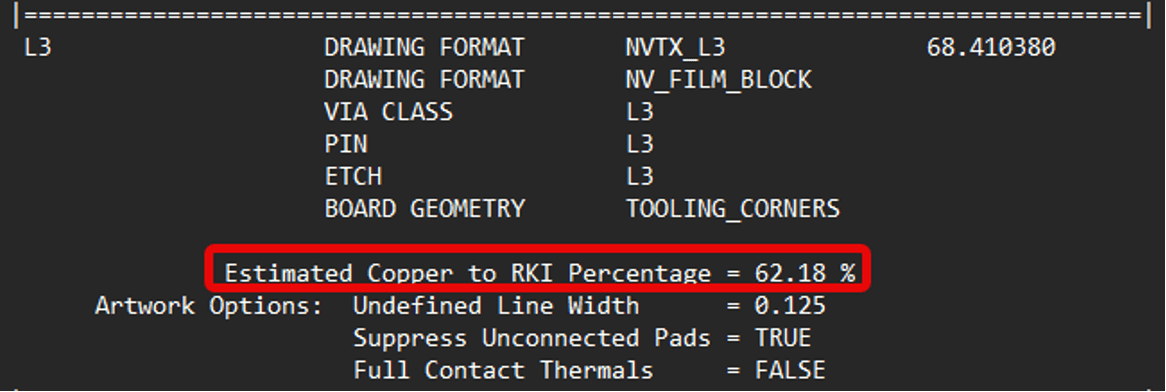 Figure 4: A screenshot or example of a copper balance analysis report from Allegro X PCB Layout showing copper percentage on layer 3 of the NVIDIA Jetson AGX Orin 64 GB - total copper area/route keep-in (RKI) = 62.18% (healthy balance).