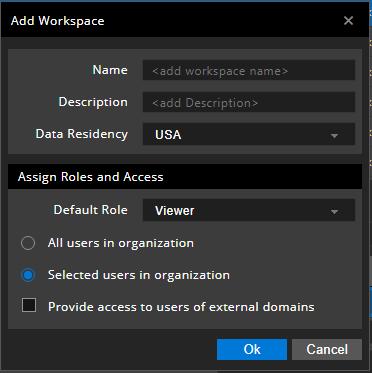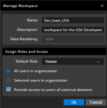 This option indicates that the people outside the organization's domain can also access the workspace based on the role assigned to them in the Workspace Configuration dialog box. If this option is checked, the workspace domain set changes to External and the same is visible in the Domain column in the Workspace Configuration dialog box. |