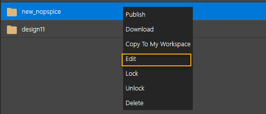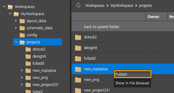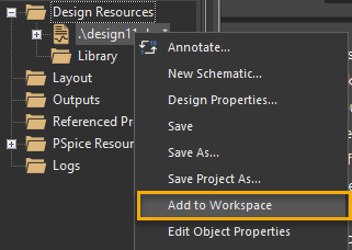 → To add a local project to the OnCloud workspace, choose File – Add to Workspace from the main menu. Alternatively, right-click the design folder in project manager and choose Add to Workspace .
