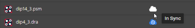 On selecting a folder in the left pane, the files and subfolders in the folder are displayed in the middle pane. The white cloud icon in the Status column indicates that the files in local workspace and the OnCloud server are In Sync . If you hover the mouse pointer over the image in the Status column, the datatip displays the current sync status of the file.