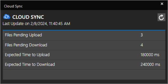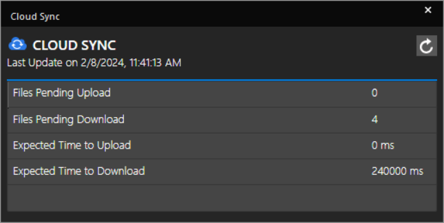 This dialog box shows the number of files pending for upload or download along with the expected time to upload or download the files. The time and date of the last time the data was updated is also indicated here. - Click the Refresh icon