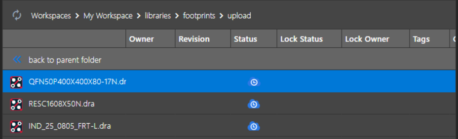 When new libraries or design files are uploaded to a workspace, the status of the files appears as Pending or Sync In Progress while the files are getting synchronized.
