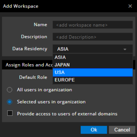 The physical or geographical location (region) where the data of a workspace resides. This mandatory field facilitates the creation of region-specific workspaces. The default value depends on the region from where the user has logged in. You can select from one of the following regions:
