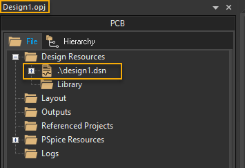 A schematic folder within the design file is also created with a schematic page within the folder. The schematic folder icon is marked with a backslash character (\) to signify that it is the root schematic folder. You can view the hierarchy in the File tab of the project manager.