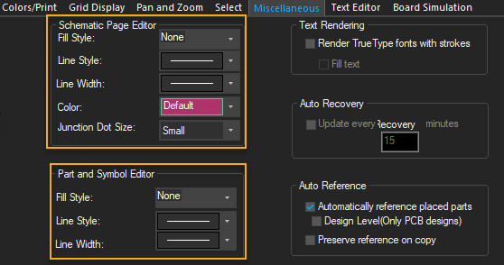 Note that you can specify separate options for the schematic page editor and the part and symbol editor. - Click the Line Style and Line Width drop-down list to display the options.