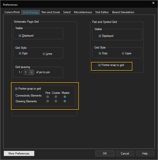 - Set the Pointer snap to grid option separately in the Schematic Page Grid and Part and Symbol Grid sections.