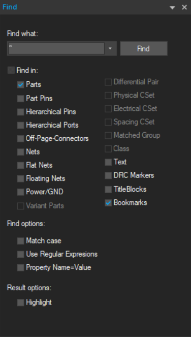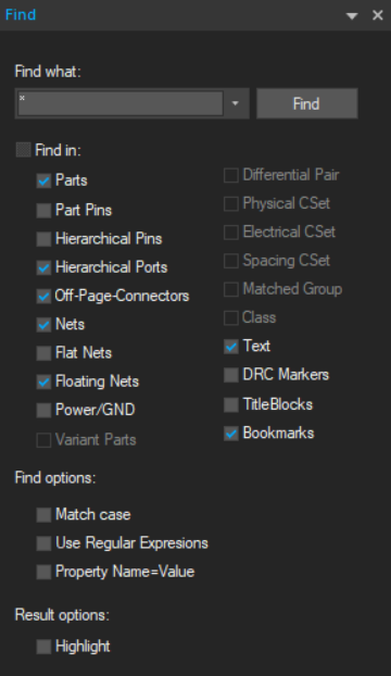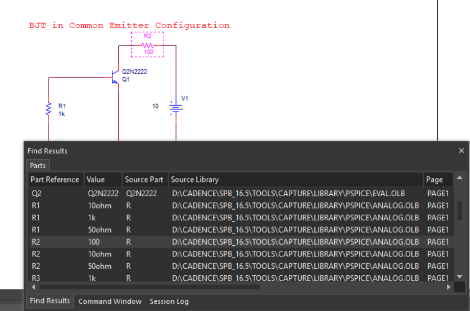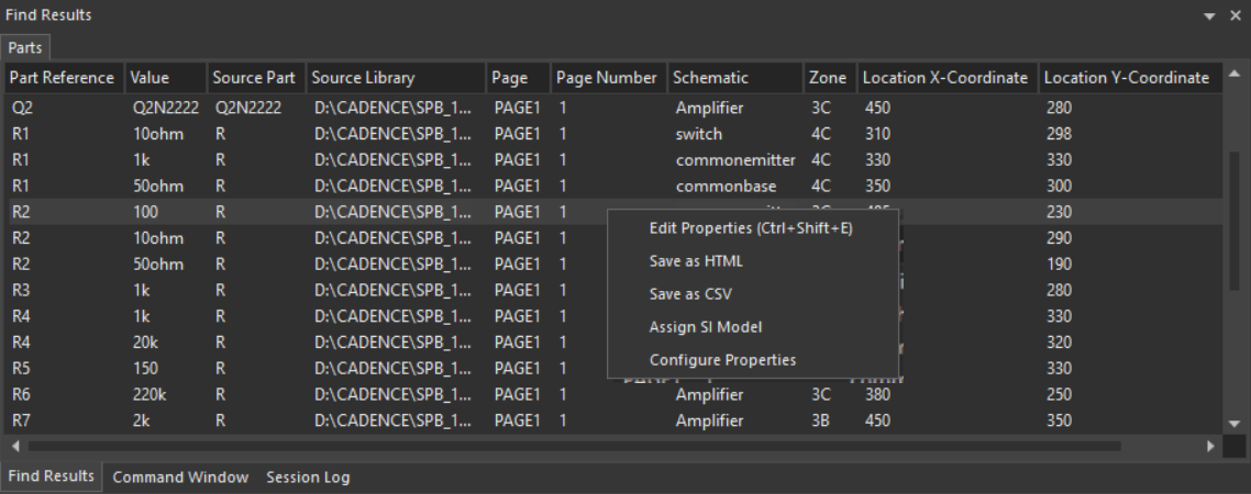Each result of the search will display as one line item in the window. A result line item contains other information besides the search object reference. This includes the page and schematic and properties specific to object types.
