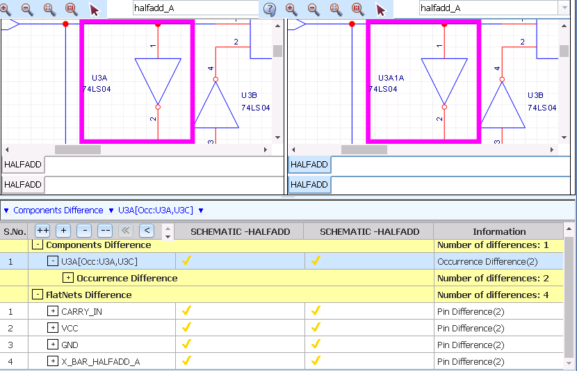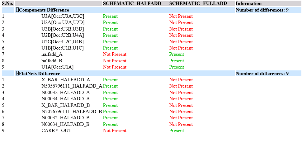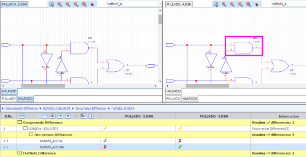 Following is an example of logical differences displayed in the HTML browser. These logical differences display different occurrence values of the same part in two different design.