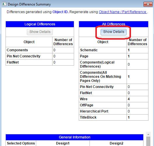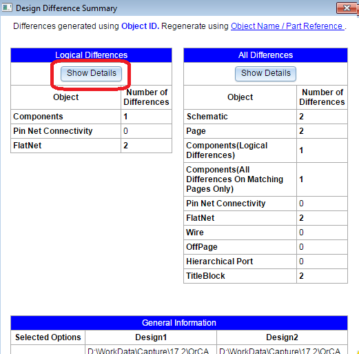 After you click Compare, you can view logical differences and all differences in the Design Difference Summary window. All differences consists of logical and graphical differences. To view details about differences, click the Show Details button in the Design Differences Summary window.