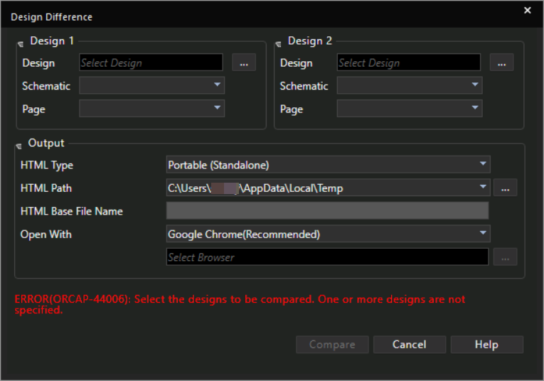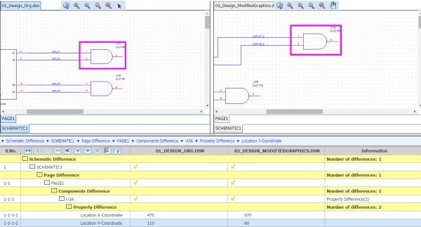 You can compare two designs, two individual schematic folders or All schematic folders, two individual schematic pages or All schematic pages.