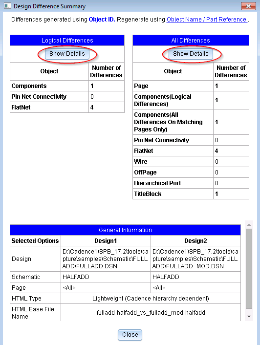Using the Design Difference dialog box, you can generate either a lightweight HTML or a portable HTML to view the differences. The lightweight HTML requires the Cadence hierarchy on the machine. The portable HTML, which takes more space on the disk than the lightweight HTML, does not require the Cadence hierarchy and can be launched from any machine.