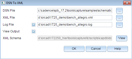 The DSN To XML dialog box opens with the design file path already updated in the DSN File field. - Change the XML file name and location, if needed.