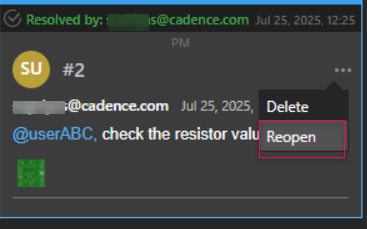 A reply can be added when marking it resolved, The resolved comment displays the status and the user name who resolved it. A comment, when resolved, removes its markup from the canvas. - You can also reopen a resolved comment. To do this, click Reopen.