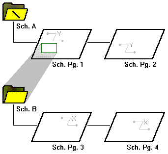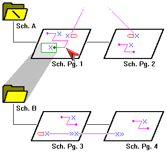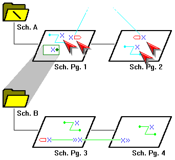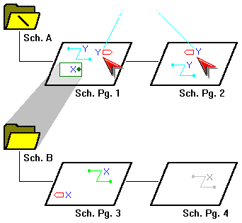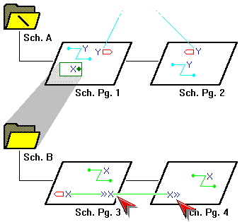 In this example, the signals at the top level (SCHEMATIC1:PAGE1) of the design need to be connected to signals on the page SCHEMATIC2:PAGE1 at lower levels of the hierarchy.