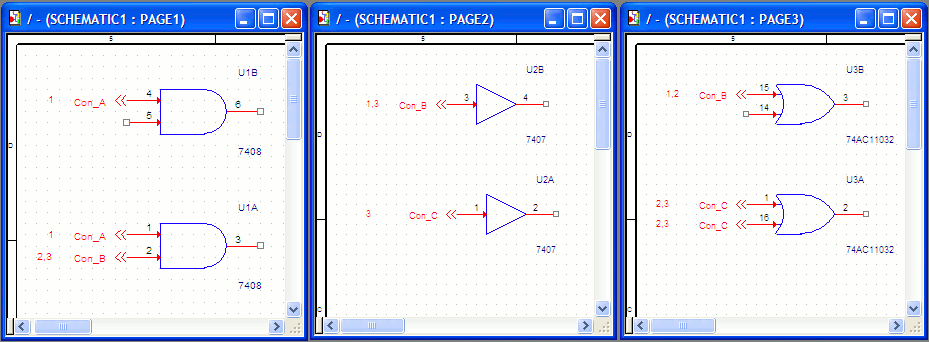 In this example, the signals on SCHEMATIC1:PAGE1 of the design need to be connected to signals on SCHEMATIC1:PAGE2.