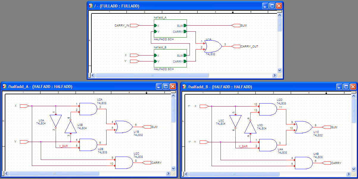 - Finally, on the page SCHEMATIC2:PAGE1, four off-page connectors, a, b, c & d, are created to tap out the corresponding signals from SCHEMATIC1:PAGE1.