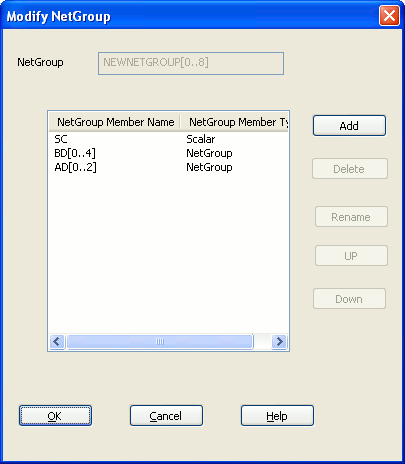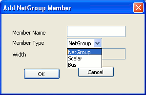 This is an empty associated NetGroup definition so we still need to add members to this NetGroup. - Specify three scalar members for the NetGroup. These will be used as entry points from the signals a, b, and y to the unnamed NetGroup. To this, add three hierarchical pins and name them a, b, and y.