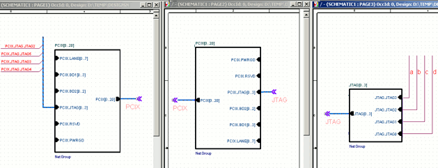 Four signals (a, b, c & d) need to be connected from the top level to the signals on SCHEMATIC2:PAGE1. - These four signals are first placed in a NetGroup JTAG that is then placed, as a member, in the large NetGroup PCIX.