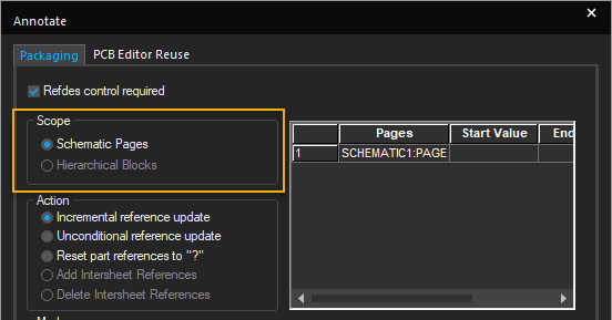 Capture currently does not support the specifying of part reference range for a portion of the design, for example, a specific schematic page or a schematic folder. You need to specify a part reference range for all the schematic pages or hierarchical blocks in your design. - Choose the Tools – Annotate menu command.