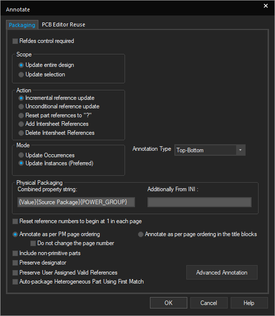 The Advanced Annotation feature provides you the capability to do multi-level annotation and property-block based annotation on a Capture Design. The multi-level annotation can be done either on a full design or selectively done on one or more schematic folders or schematic pages.