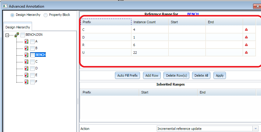 The Auto Fill Prefix button provides you an option to auto-scan the number of prefixes found in a design. Once you click the button, the prefixes' count is automatically filled-up in the Instance Count column of the Reference Range table.