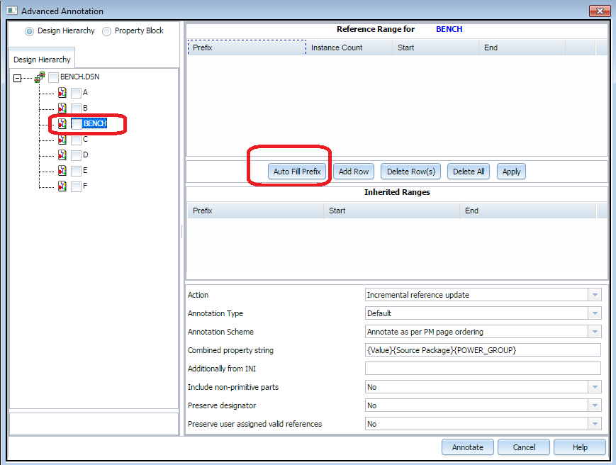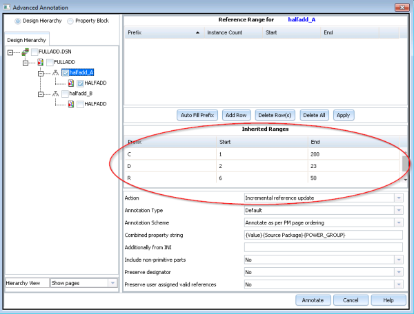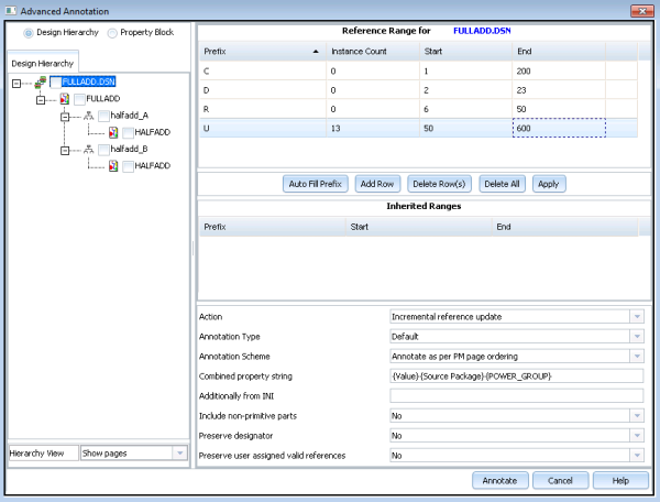 You can assign reference range in the Advanced Annotation dialog box for a complete design, an individual hierarchy block, an individual page in a hierarchy, or a property block.