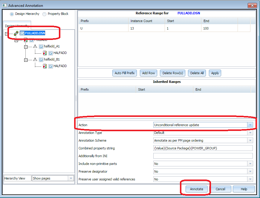 For example, to annotate a complete design. Select the FULLADD.DSN check box in the design hierarchy tab. Once the FULLADD.DSN check box is selected, all the lower-level blocks are automatically selected.