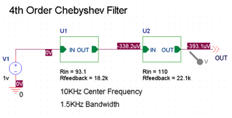 This fourth-order Chebyshev filter schematic illustrates how the SUPARAM part may be used to pass design parameters from a top-level (parent) schematic to a subcircuit (child) schematic in a hierarchical design.