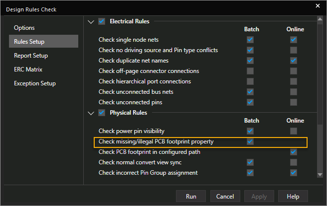 - Under the the Physical Rules section, select the various physical rules to be checked on your design.