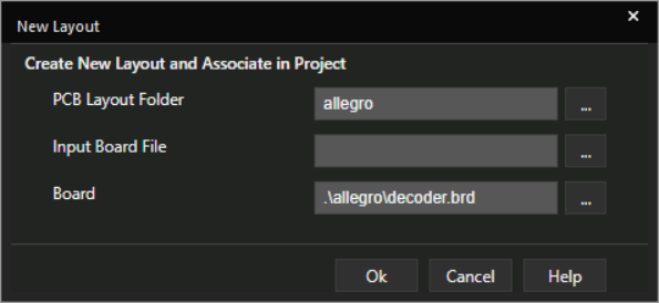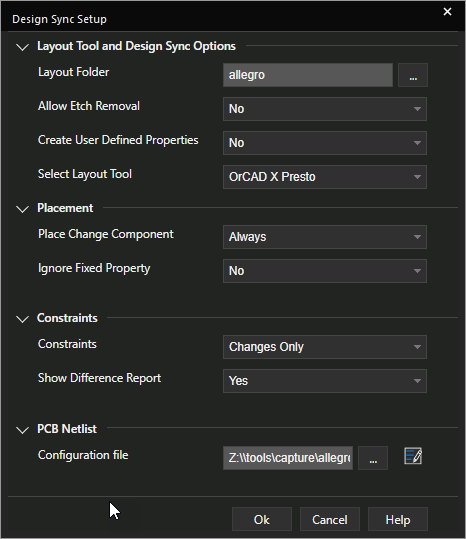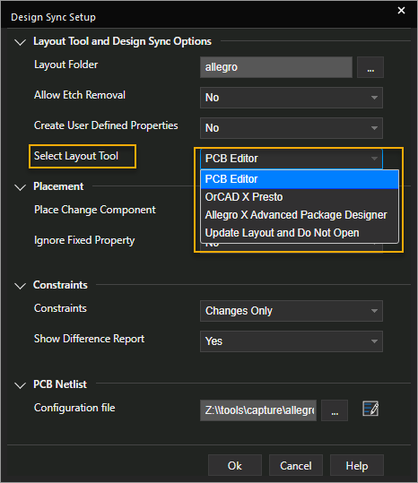 - Complete the appropriate options in the dialog box. Either select the Create or Update PCB Editor Board (Netrev) option to open a